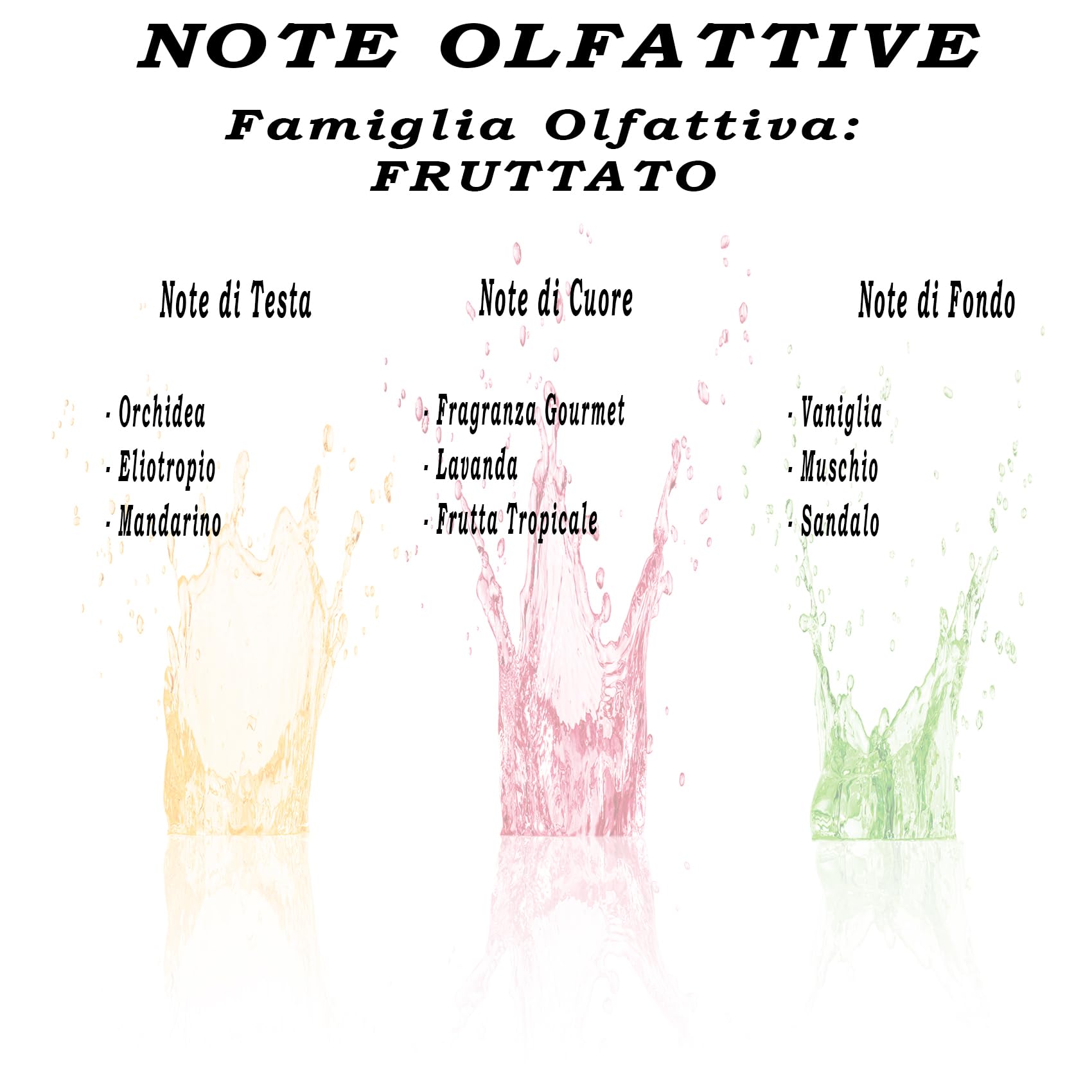 L’apertura fruttata di orchidea, eliotropio e mandarino sprigiona subito un’atmosfera delicata e gourmand, mentre il cuore rivela una scia più sensuale fatta di note cremose, lavanda e frutta tropicale.