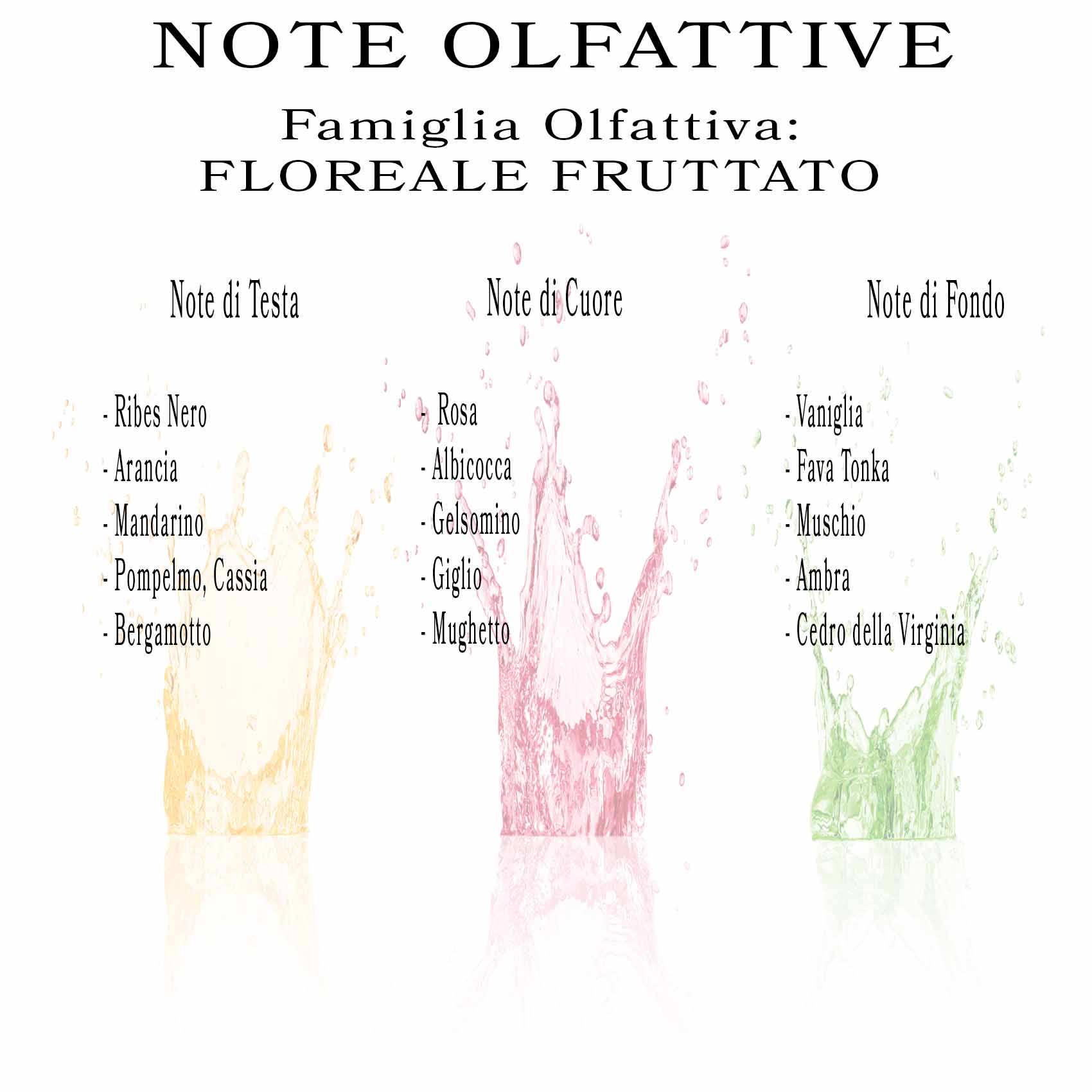 Un’esplosione luminosa di frutta e agrumi che risveglia l’energia e la gioia di vivere. Le note floreali di rosa e agrumato donano freschezza e leggerezza, mentre la dolcezza del legno, del muschio e dell’ambra chiude con un abbraccio caldo e avvolgente. Un profumo che celebra la bellezza dell’amore e della vita.