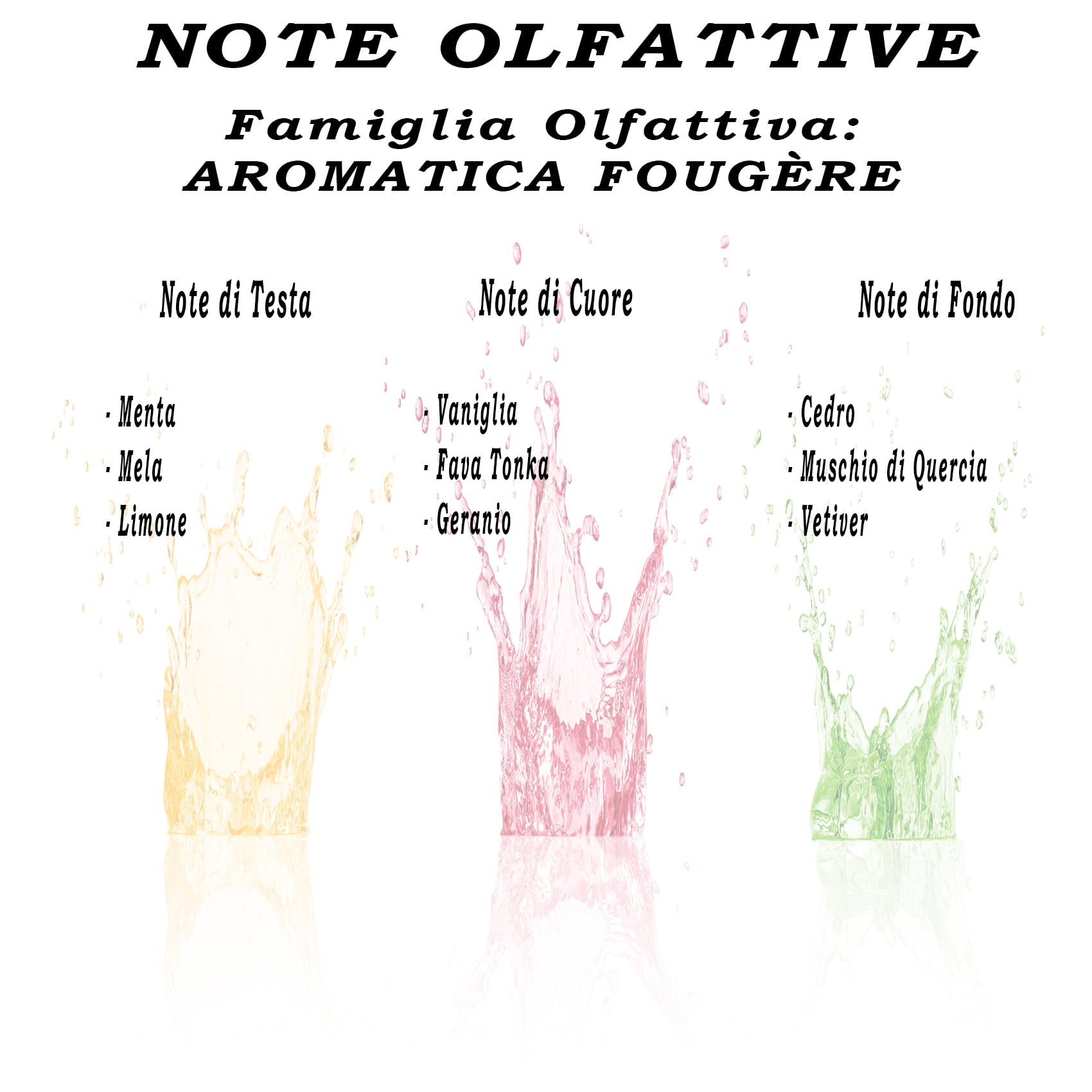 Un'apertura frizzante di menta e mela incontra la dolcezza agrumata del limone, per poi cedere il passo a un cuore speziato di vaniglia e fava tonka, ammorbidito dal tocco aromatico del geranio. Il fondo, caldo e avvolgente, affonda nelle venature legnose di cedro, vetiver e muschio di quercia. Una fragranza maschile dolce e speziata, pensata per chi ama distinguersi con eleganza discreta.