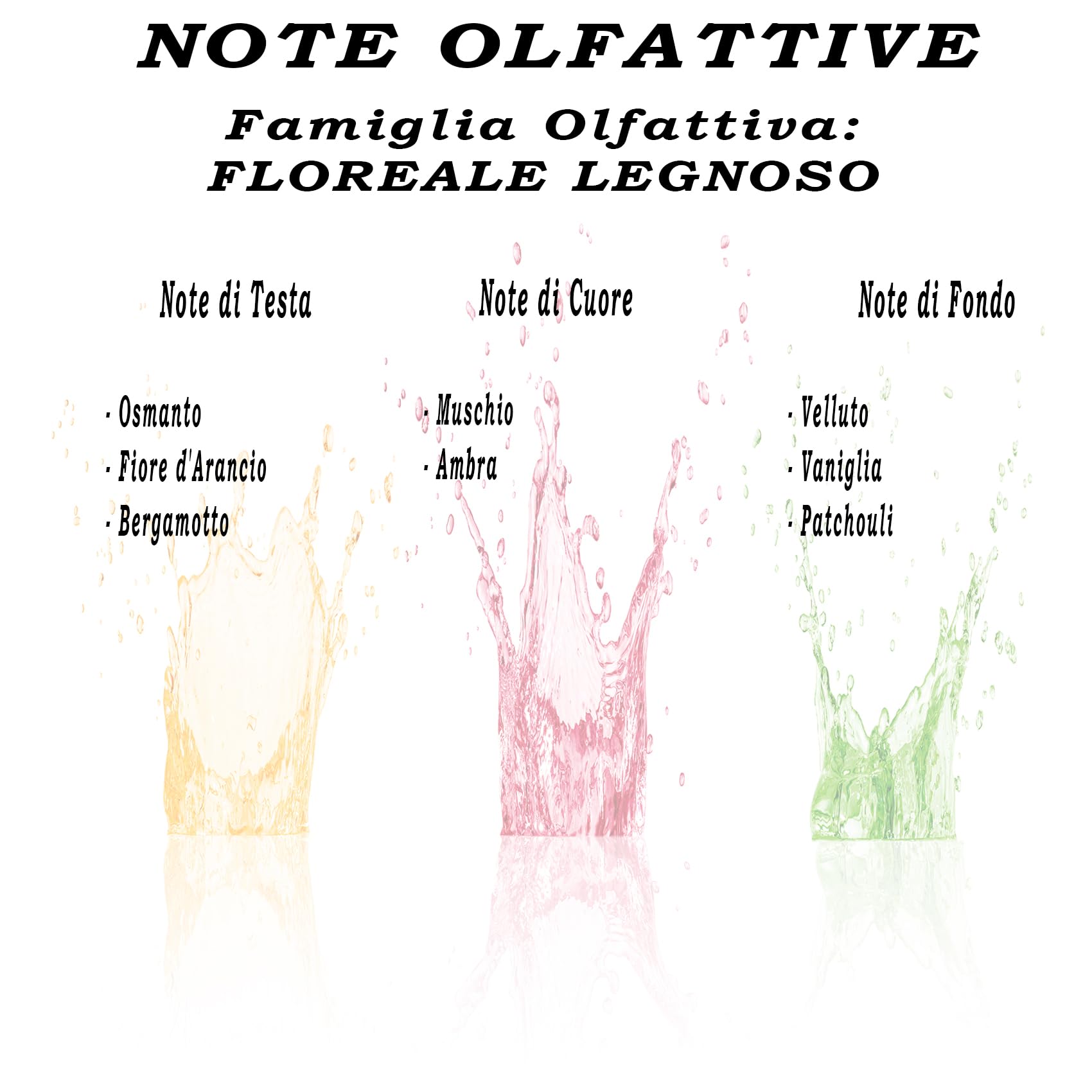 Un’apertura frizzante di osmanto e fiori d’arancio che incanta con la sua freschezza. Il cuore è un bouquet magnetico di gelsomino e rosa bulgara che avvolge con sensualità. Il fondo vellutato di vaniglia, patchouli e muschio crea una scia avvolgente e duratura, capace di catturare l’attenzione in ogni momento.